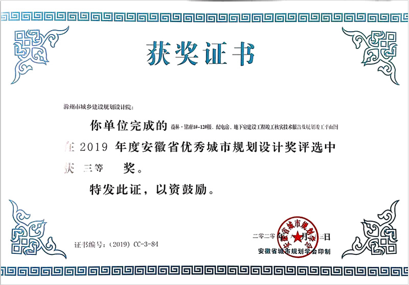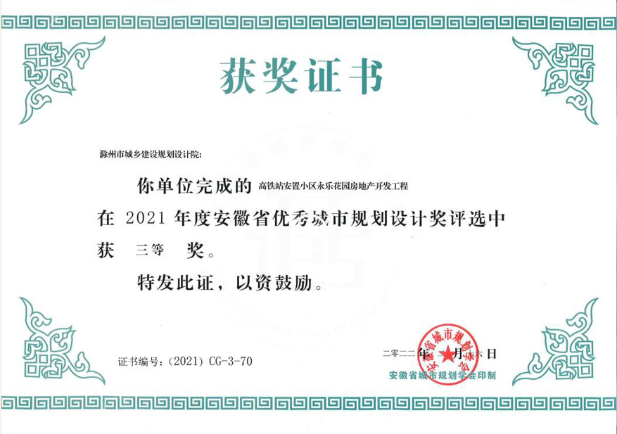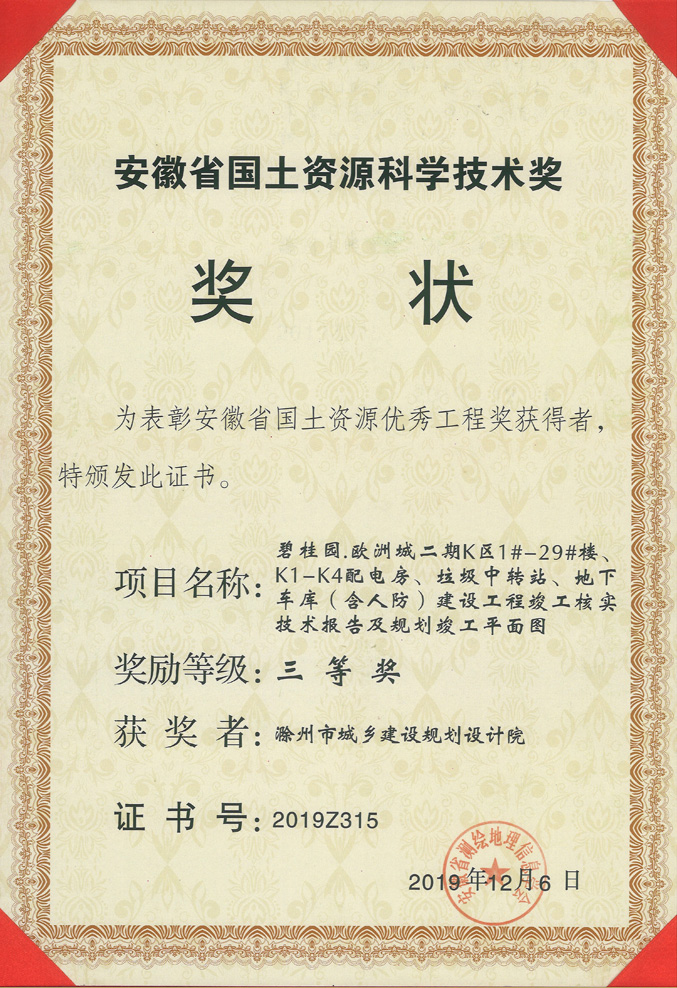滁州市經(jīng)開區(qū)地形圖測繪規(guī)劃獲獎證書